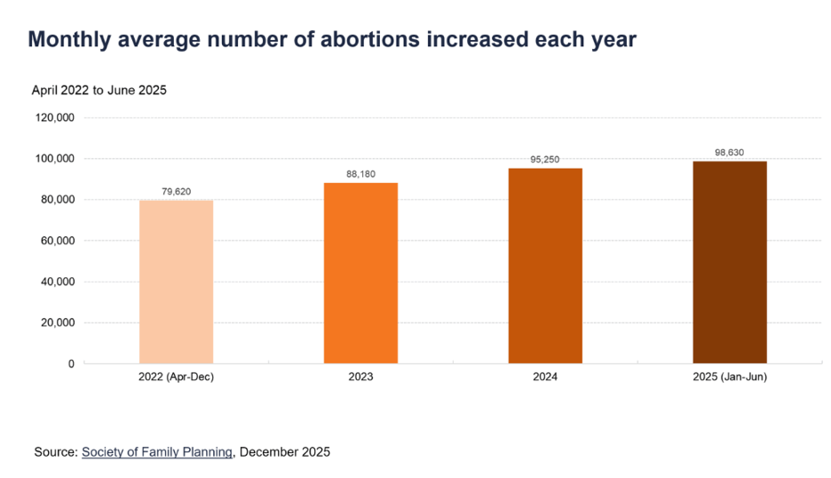 The monthly average number of abortions inside the medical system climbed from 79,600 in 2022 (April to December only), to 88,200 per month in 2023, to 95,300 in 2024, to 98,800 per month on average in the first six months of 2025.