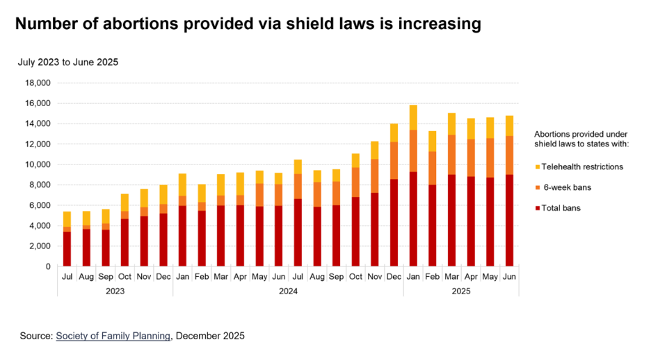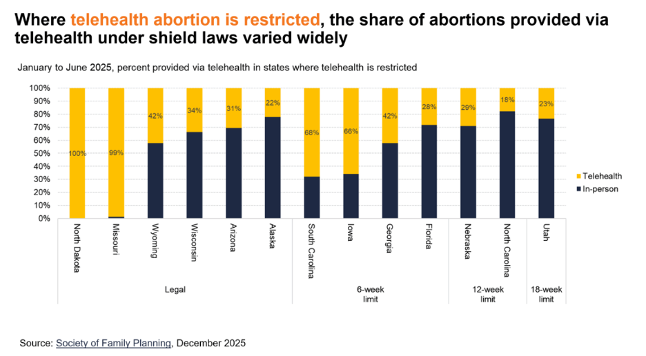 In states banning abortion entirely, nearly all clinician-provided abortions were done via telehealth under shield laws.