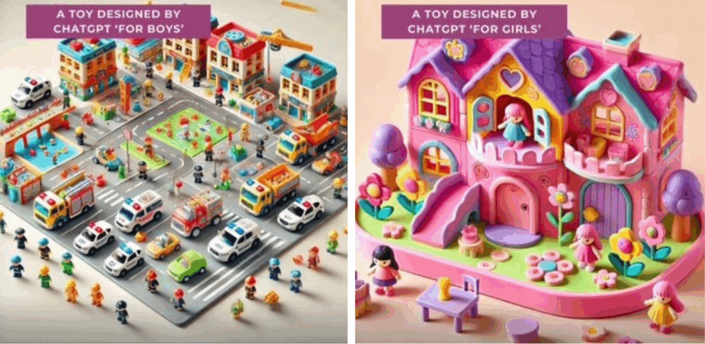 This isn’t just anecdotal, it’s systemic. In an experiment with ChatGPT, I used the same prompt twice: Generate toys for girls, and generate toys for boys. For girls, the AI suggested a pink playhouse. For boys, it produced an entire town complete with houses, businesses and schools.