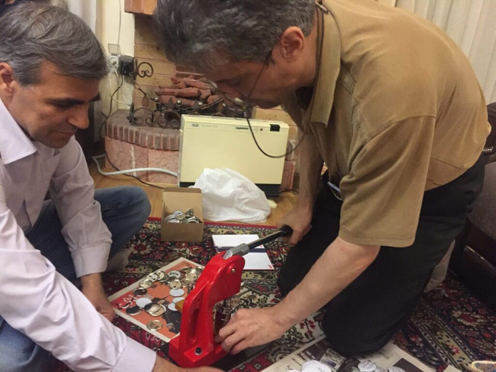 Khandan was first arrested in 2018, along with his friend Dr. Farhad Meysami, for creating thousands of handmade buttons that said, “I OPPOSE THE MANDATORY HIJAB.” The charges against them included “gathering and collusion against national security,” “propaganda against the regime” and “spreading and promoting not wearing a hijab.” Khandan served 111 days of a six-year sentence before being released on bail so he could care for his children while Nasrin Sotoudeh was in prison. A severely malnourished Farhad was freed in February 2023.