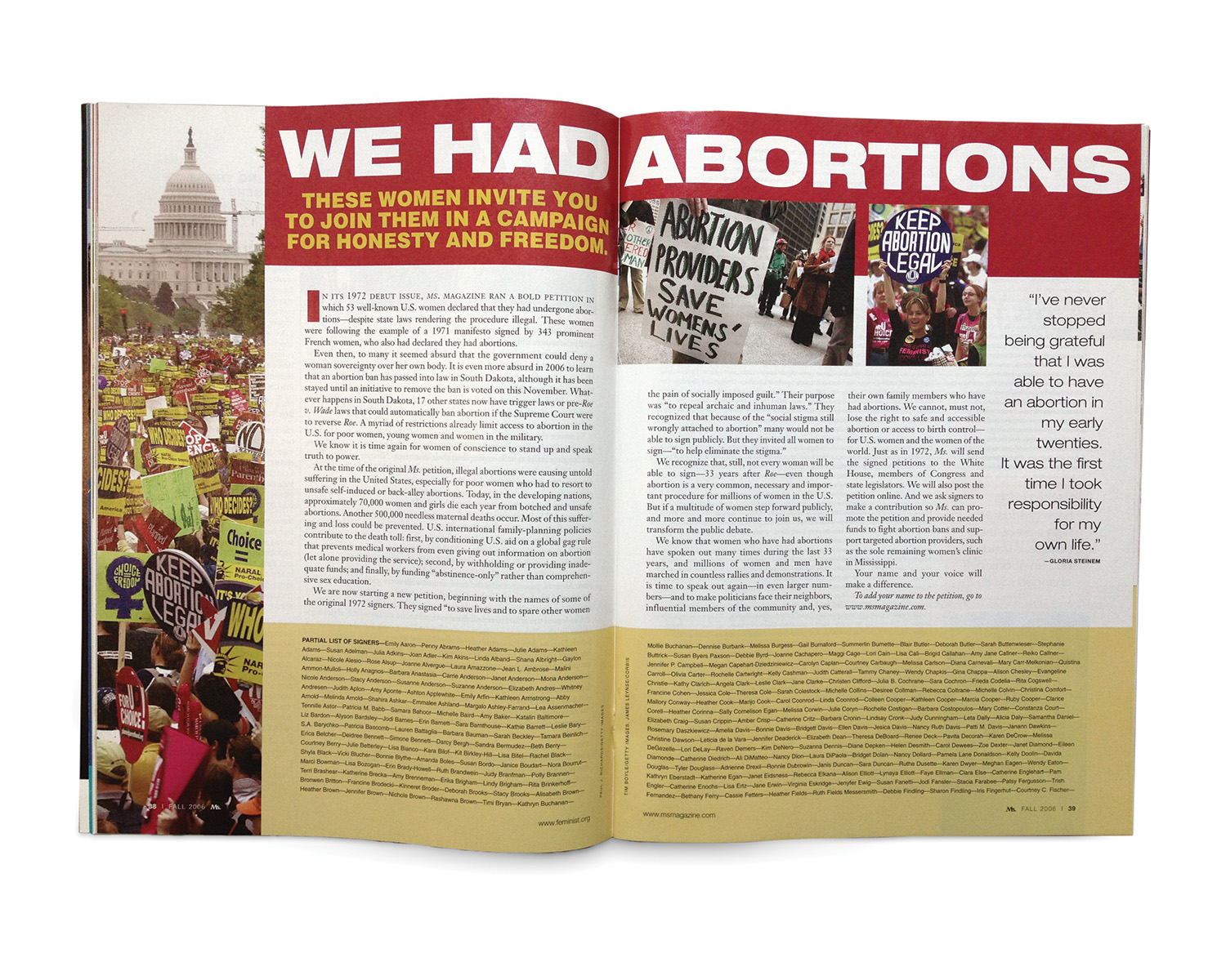 Roe v. Wade was another milestone for me. The preview issue of Ms., which came out a few months before I had any idea I would be part of the magazine, had featured a petition entitled “We Have Had Abortions,” signed by 53 celebrities who were brave enough to admit that they had broken the law. I was stunned. Others shared my secret. Readers were invited to add their names. I sent in my coupon with a sense of relief. A few months later—by then I was at the magazine and helping to open the envelopes—we published the names of the hundreds of women who, along with me, had signed on.